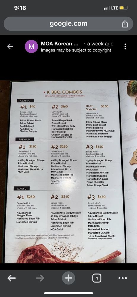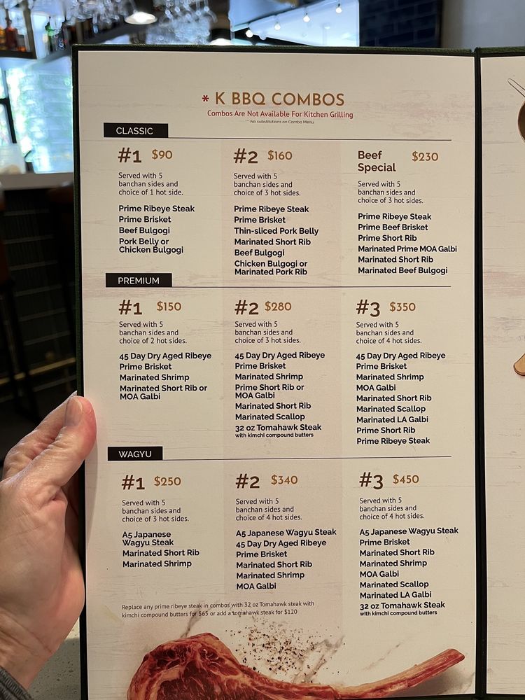 Choose or Meats from the A La Carte BBQ menu below. Served with () Chef-selected banchan sides and white rice. Price will vary. oz Tomahawk Steak not eligible
