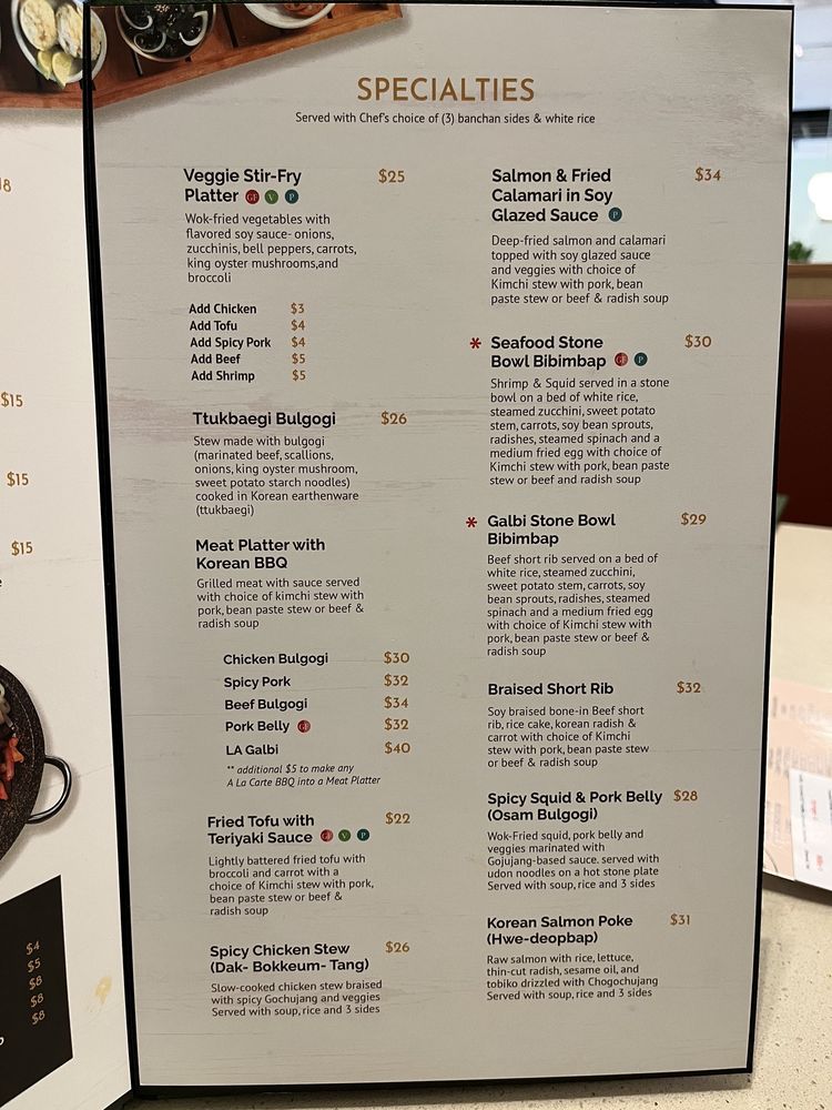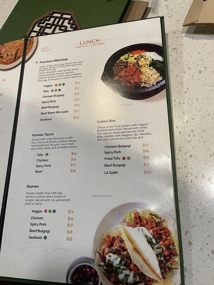 Choice of Spicy Gochujang Sauce or Non-Spicy Soy Sauce. Served in a stone bowl and a side of beef broth soup. Sweet potato stems, carrots, soy bean sprouts, radishes, steamed spinach, zucchini and a shredded fried egg, all served on a bed of white rice (Runny/ fried egg +$) Choice of protein: Veggie, Tofu, Chicken Bulgogi, Spicy Pork, Beef Bulgogi, Beef Short Rib Galbi, Seafood