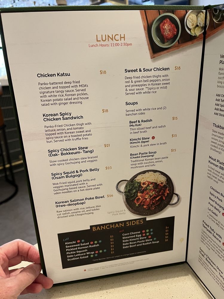 Panko-battered deep fried chicken topped with MOA's signature tangy sauce. Served with white rice, Korean pickles, Korean potato salad and house salad with ginger dressing